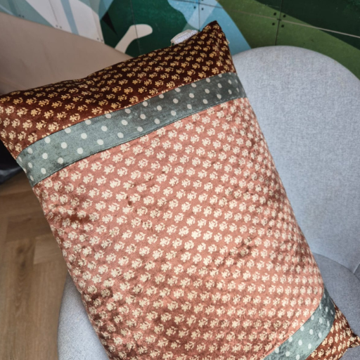 Dit royale fluwelen kussen is een echte sfeermaker. Het patchwork van verschillende prints en kleuren zorgt voor een rijke, gelaagde uitstraling, terwijl het zachte fluweel direct een luxe gevoel toevoegt aan je interieur.