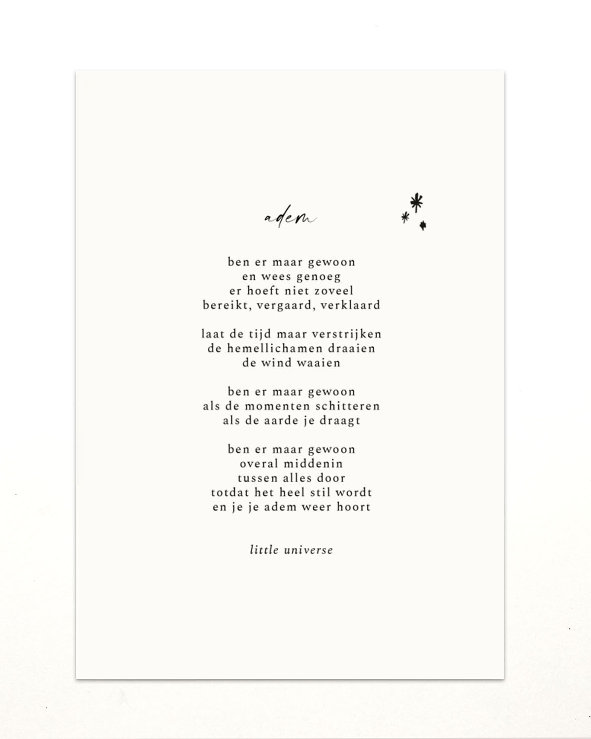Een moment van stilte, gevangen in woorden. Deze A5-poster met het gedicht ‘Adem’ van Britt Nelissen (Little Universe) nodigt uit om even stil te staan – bij jezelf, bij het leven, bij wat er is.