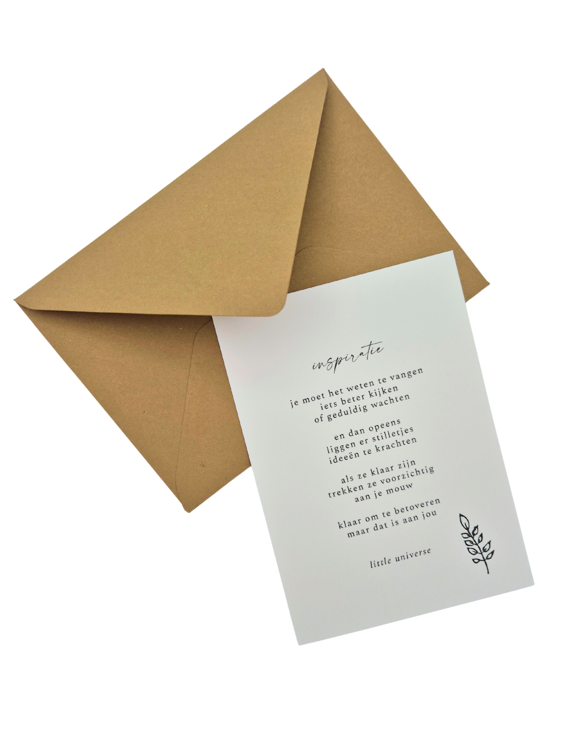 Soms zegt een kaart precies wat jij niet in woorden kunt vatten. Deze A6-kaart van Little Universe bevat een stukje poëzie van Britt Nelissen, gedrukt op stevig, crèmekleurig papier met een warme, natuurlijke uitstraling.