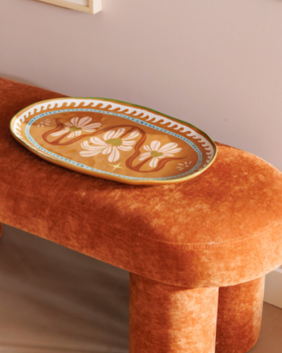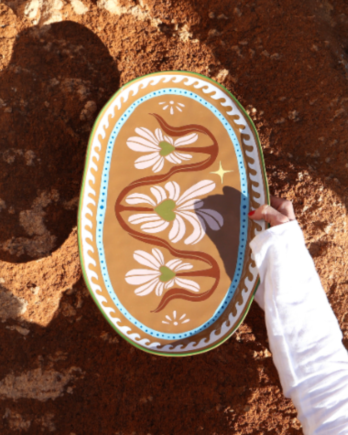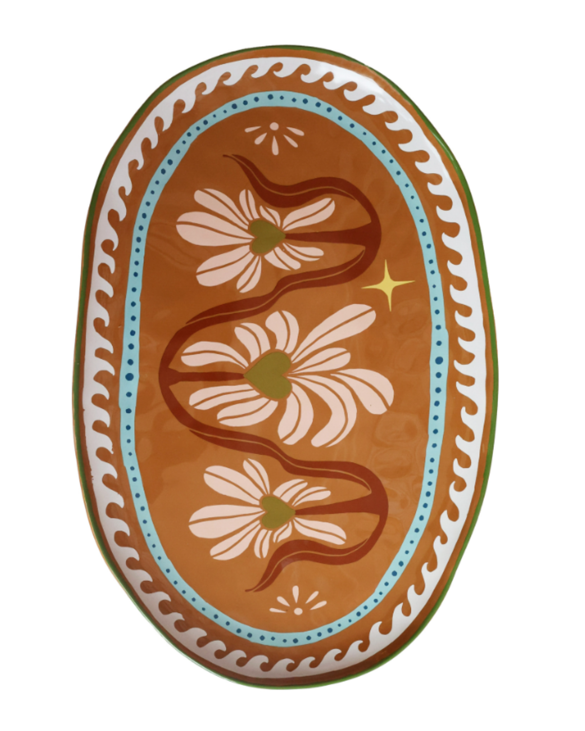 Perfect voor het serveren van salades, brood, hapjes of shared dishes – maar net zo mooi als decoratief object op een open plank of keukentafel. Deze schaal brengt direct warmte, vrolijkheid en een vleugje luxe in huis.