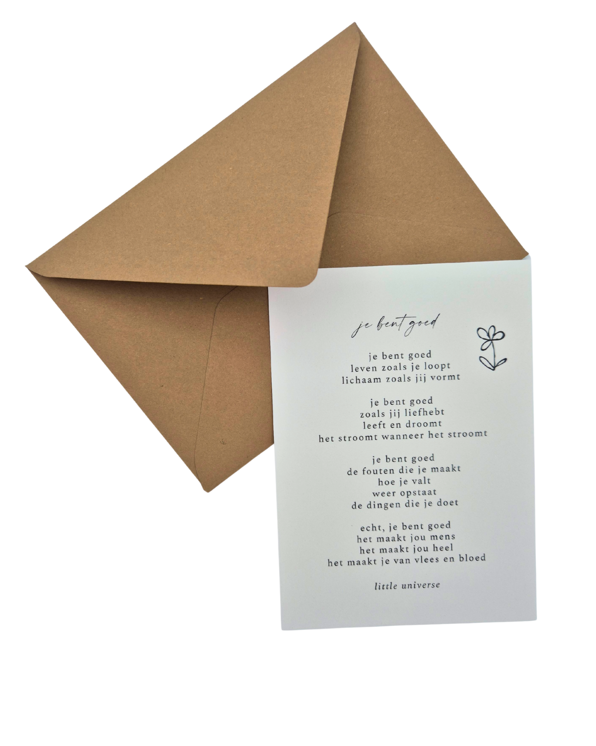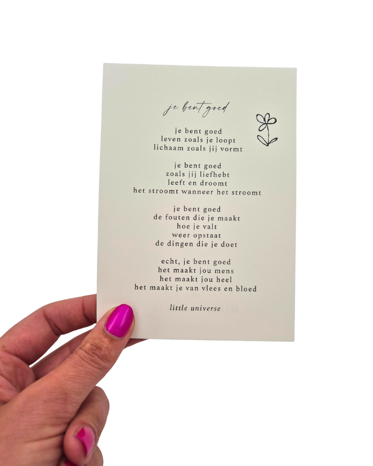 Soms is één zin genoeg om iemand te laten glimlachen. Dit ontroerende gedicht van Britt Nelissen (Little Universe) is een liefdevolle reminder: je bent goed, precies zoals je bent. Een kaart die kracht geeft en warmte verspreidt, perfect om cadeau te doen of zelf in huis een speciaal plekje te geven.