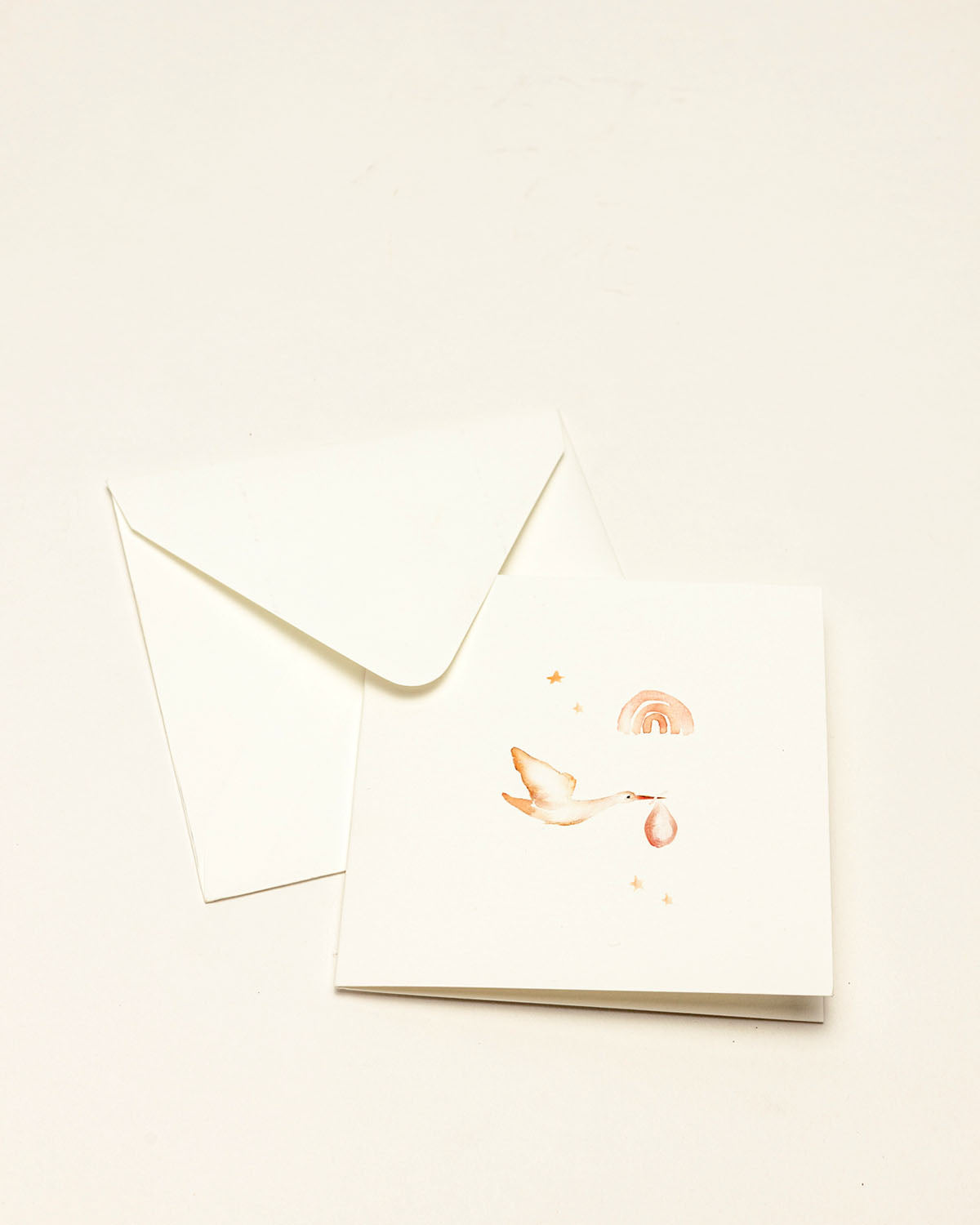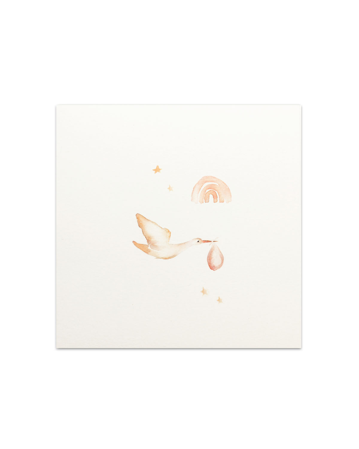 Vier het mooiste nieuwtje met dit lieve kaartje van Iris van Dijck. Een zachte roze regenboog en een charmante ooievaar samen op één kaartje, perfect om geboorte, nieuw leven te vieren.