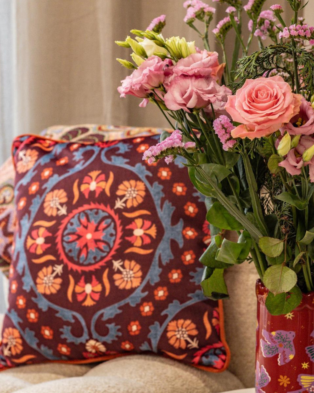 Laat je interieur stralen met kussen Puglia, een fluweelzachte mix van luxe, kleur en karakter. Dit  velvet kussen is een echte blikvanger dankzij de prachtige warme tinten en mooie print.  Het zachte katoenvelours geeft een warme, elegante uitstraling, terwijl de speelse patronen zorgen voor een vleugje eclectische charme.