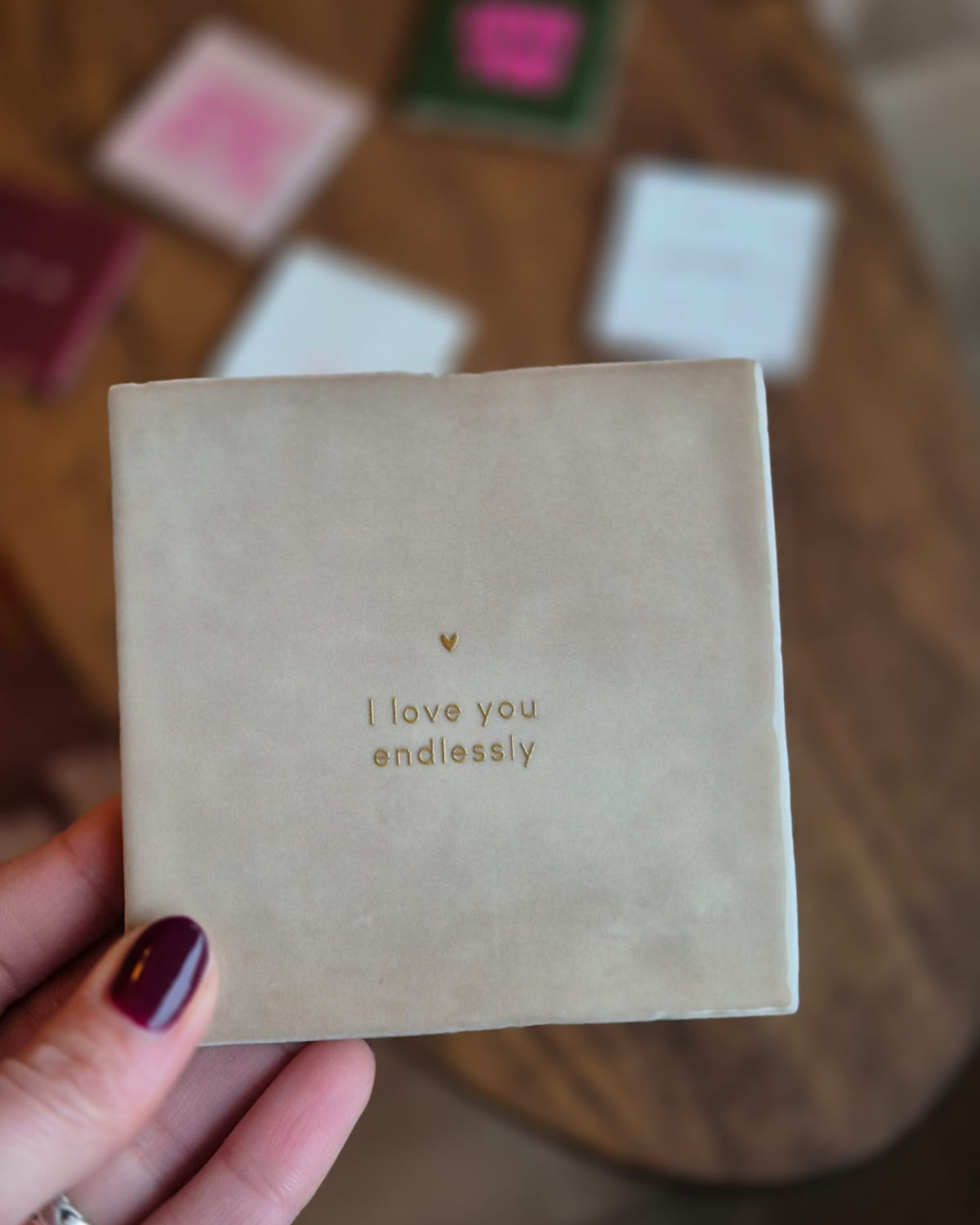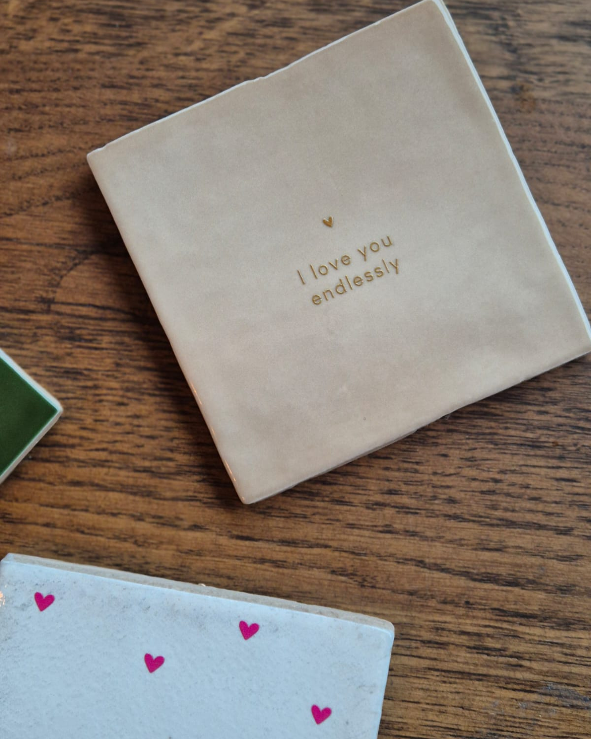 Dit beige tegeltje met de gouden tekst “i love you endlessly” is een klein kunstwerkje vol gevoel. Zacht van kleur, rijk in uitstraling en tijdloos in boodschap.