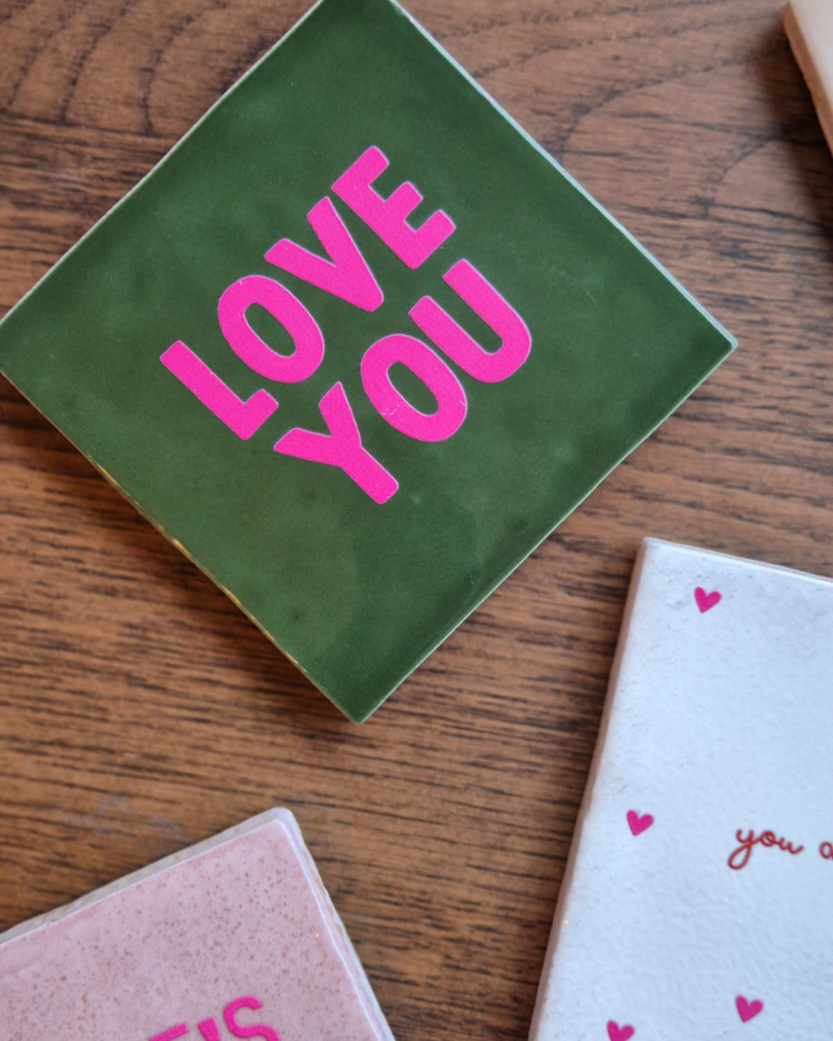 Dit donkergroene tegeltje met de roze tekst “Love You” is lief, krachtig en precies genoeg. Geen uitleg nodig, deze woorden doen het werk. Elke dag opnieuw.